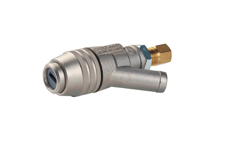 El cabezal tiene una conexión G 1/4F y se agrega  una boquilla 1/4 NPT 15° (no Incluida)  y un diámetro de boquilla de manguera de 21 mm.
